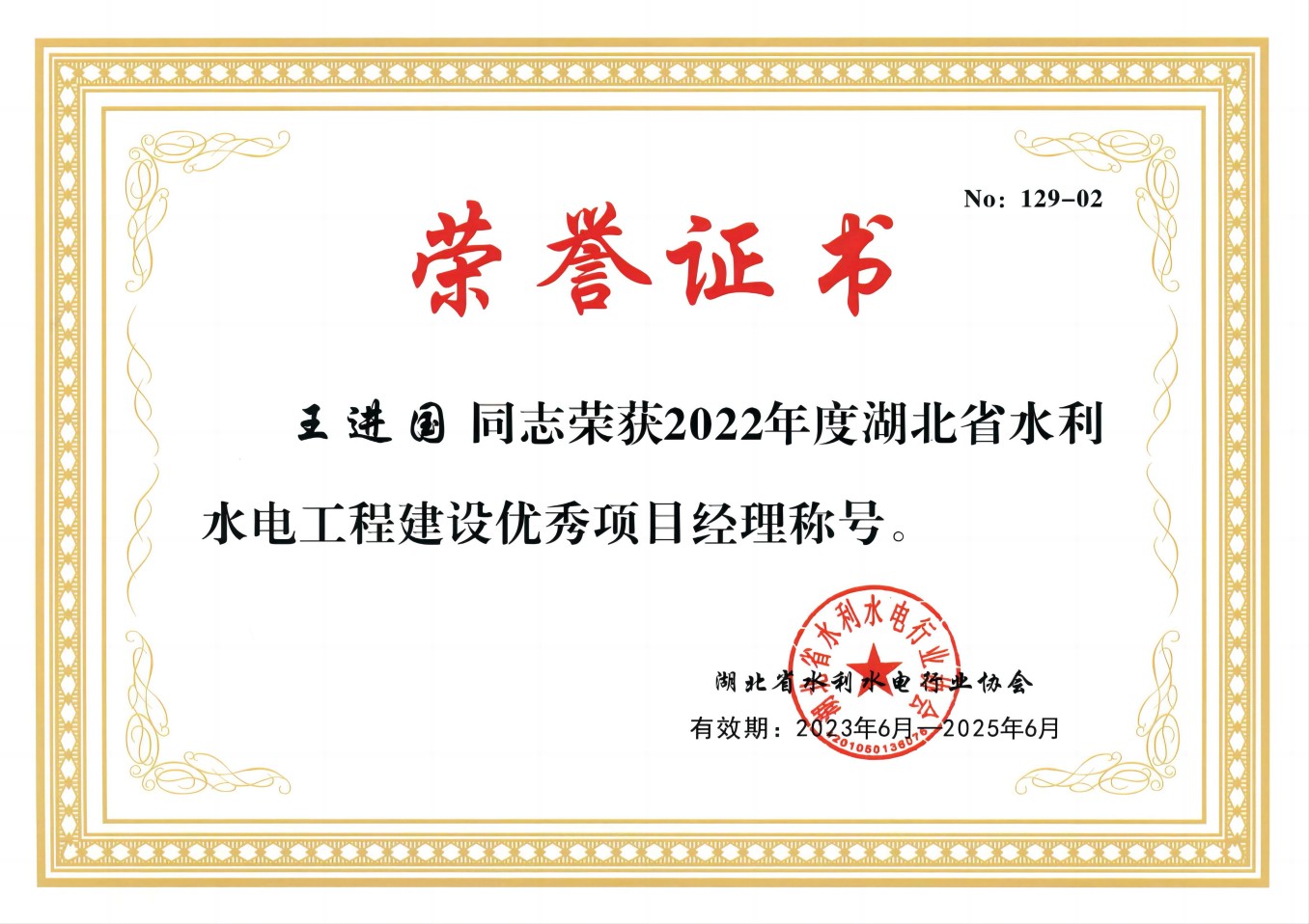 王進國被評為2022年度湖北省水利水電工程建設優(yōu)秀項目經理