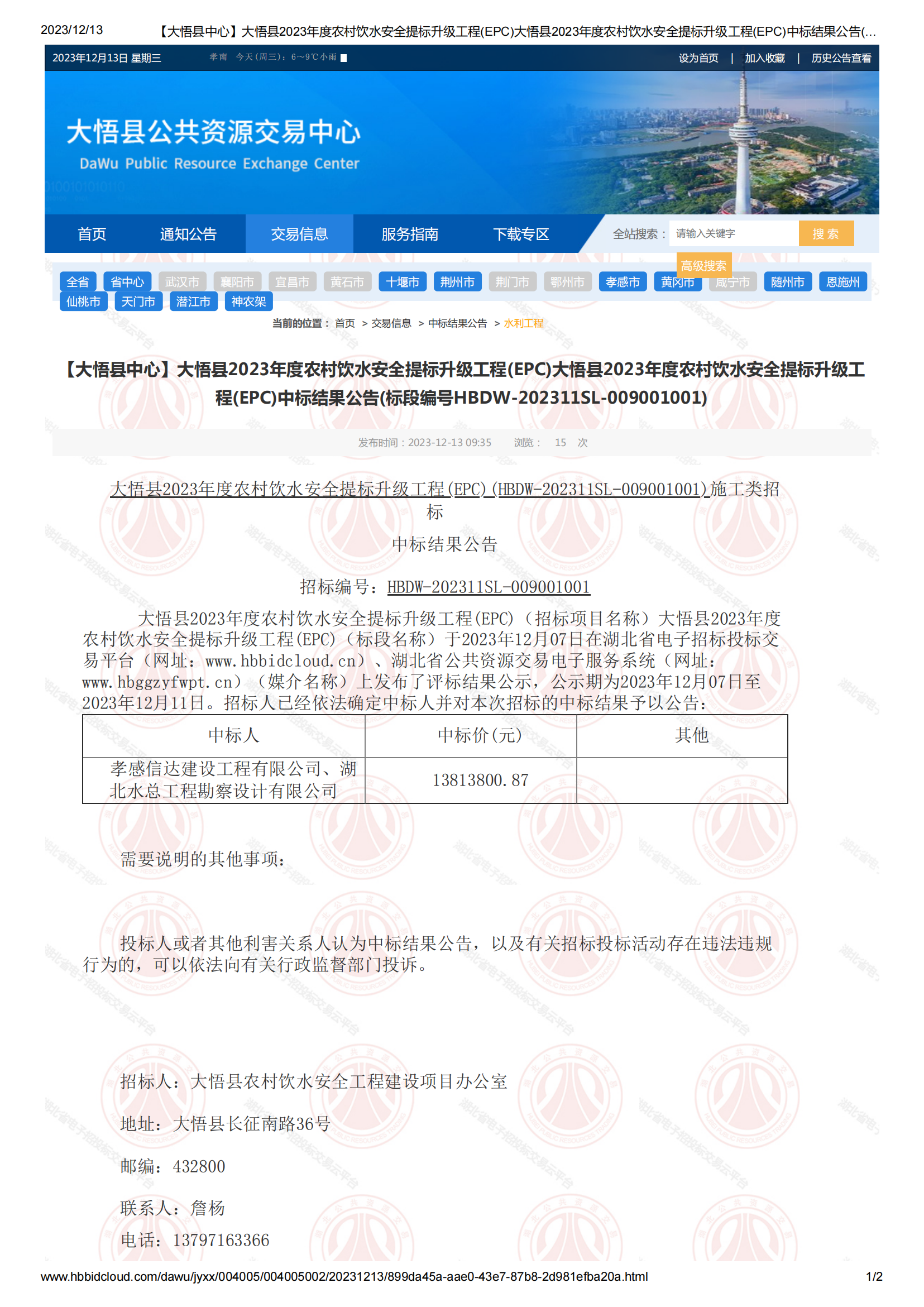 大悟縣2023年度農(nóng)村飲水安全提標(biāo)升級工程(EPC)
