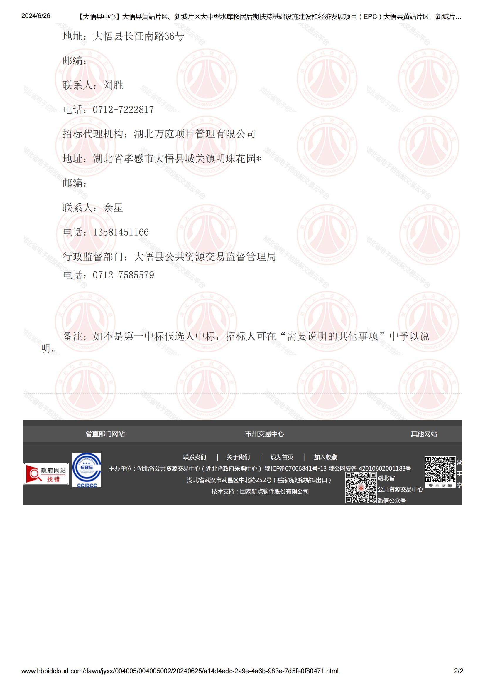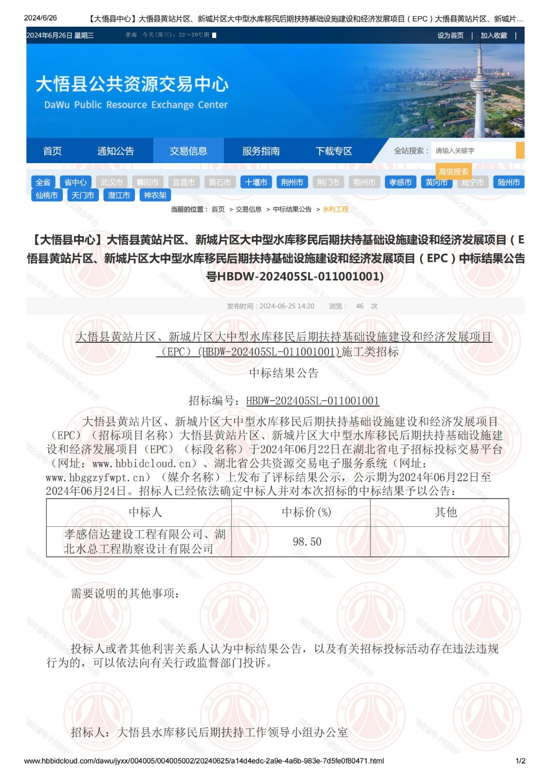 項(xiàng)目名稱:大悟縣黃站片區(qū)、新城片區(qū)大中型水庫(kù)移民后期扶持基礎(chǔ)設(shè)施建設(shè)和經(jīng)濟(jì)發(fā)展項(xiàng)目(EPC)
